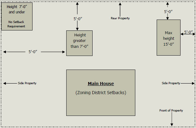 Structures located in the rear or side yard and less than 7-feet in height are not subject to setback requirements. Structures located in the rear or side yard and over 7-feet in height must maintain a 5-foot setback from all property lines. The combined maximum square footage of all detached accessory structures exceeding 7-feet shall not exceed 1,000 square feet.