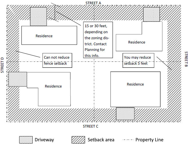 My house is on a corner lot. Do I have to follow the setback rules on the street side of my property?The City's Municipal Code allows you to construct a 7-foot fence/wall 5 feet closer to the corner-side property line if the house behind you does not have their driveway off of the corner side street.