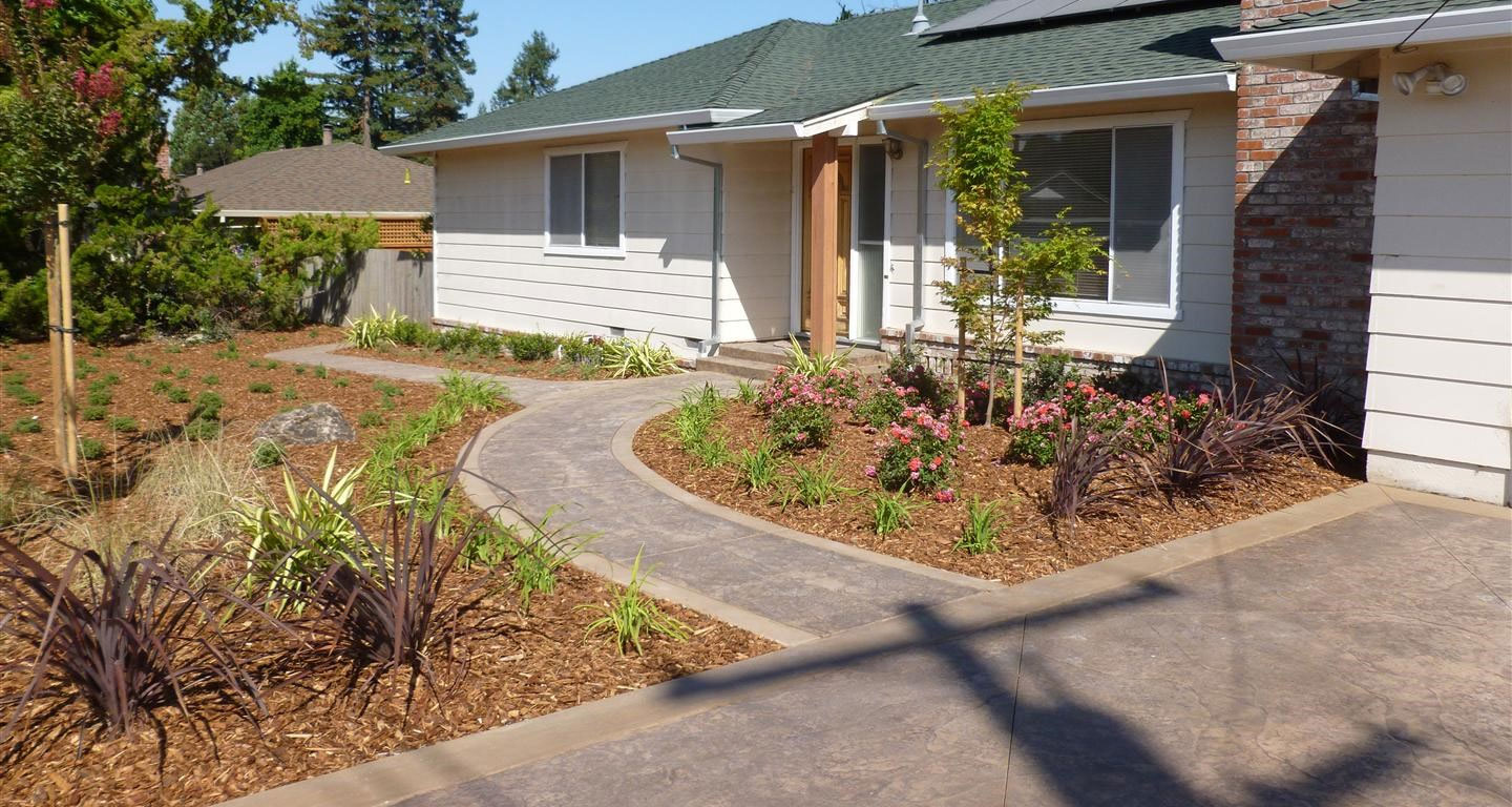 There are many designs that can reduce the amount of thirsty turf-grass and include less water intensive plants while still providing an attractive front yard landscape. Your local nursery is a good starting point to inquire about native, drought tolerant plants and how to use them in your landscaping.