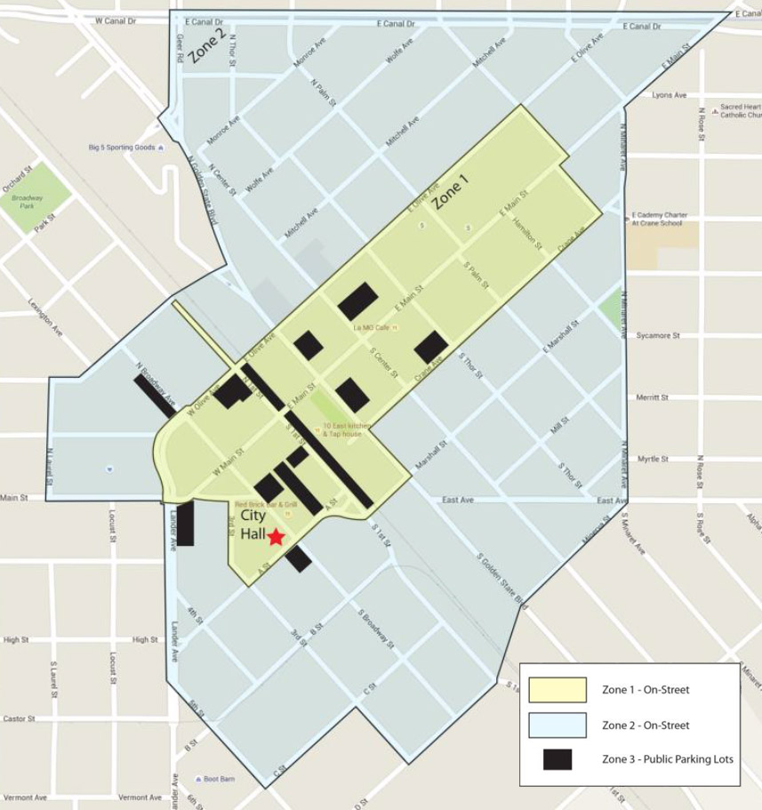 Also known as the core of the Downtown area, Zone 1 offers 800 on-street parking spaces. Potential users include those who visit and/or work at the businesses, merchants, and restaurants in the Downtown area. Most of the off-street public parking lots (Zone 3) are located within the core Downtown area.