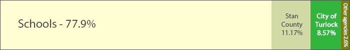 In Stanislaus County, homeowners pay 1% of the assessed taxable value of their home in property tax. This money goes to the County (11.17%), the schools (77.9%), the City (8.57%), and other agencies through tax sharing agreements (2.6%).