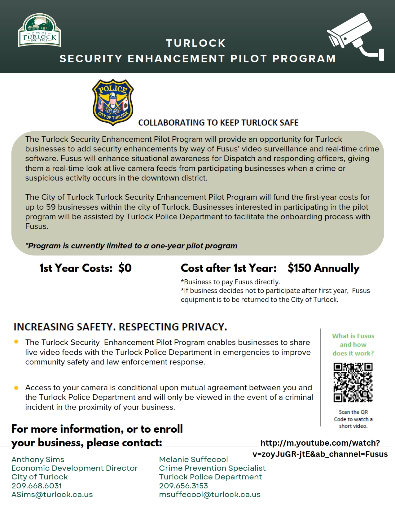 The City of Turlock Turlock Security Enhancement Pilot Program will fund the first-year costs for up to 59 businesses. Turlock businesses interested in participating in the pilot program will be assisted by Turlock Police Department to facilitate the onboarding process with Fusus.