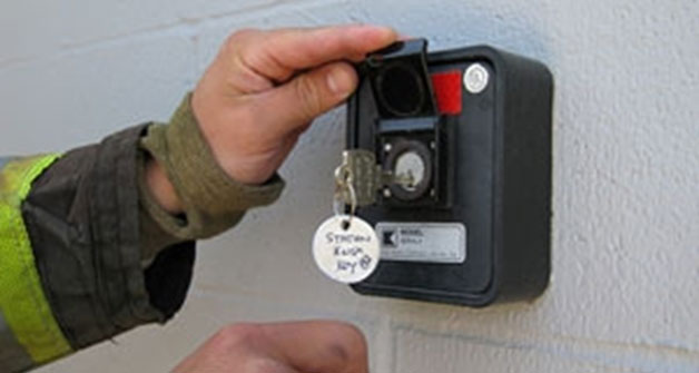 A Knox-Box, is a small wall-mounted safe that holds building keys for Turlock Fire Department to retrieve in emergency situations after normal working hours. Turlock Fire Department secures a master key to the Knox Box in a coded Knox safe on the engines, so they can quickly enter a building without having to force entry. A Knox Box is not required however, greatly encouraged because it can cut fire losses for building owners since firefighters can enter buildings without breaking doors or windows.