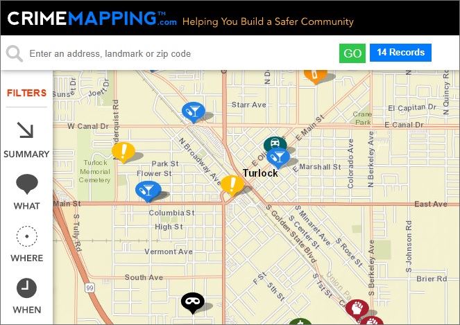 CrimeMapping.com will help the Turlock Police Department provide the public with information about recent crime activity in their neighborhood. The CrimeMapping.com website has an FAQ page here.